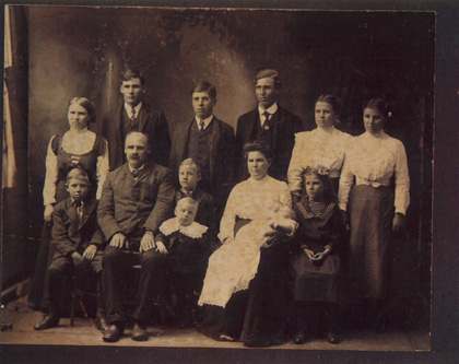 W.M. Hiram Dozier Family - 1908 Back row - Eva, Jimmy, Ira, Solomon (Sal), Angie, Nora Front row - Clifford, William Hiram (father), Clarence/Cecil Bernard, Dora May [Smith] (mother) - holding Dollie, Nellie
