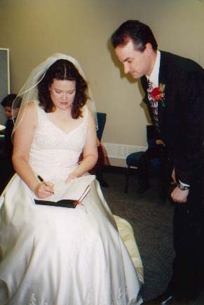 Tess signs wedding certificate
