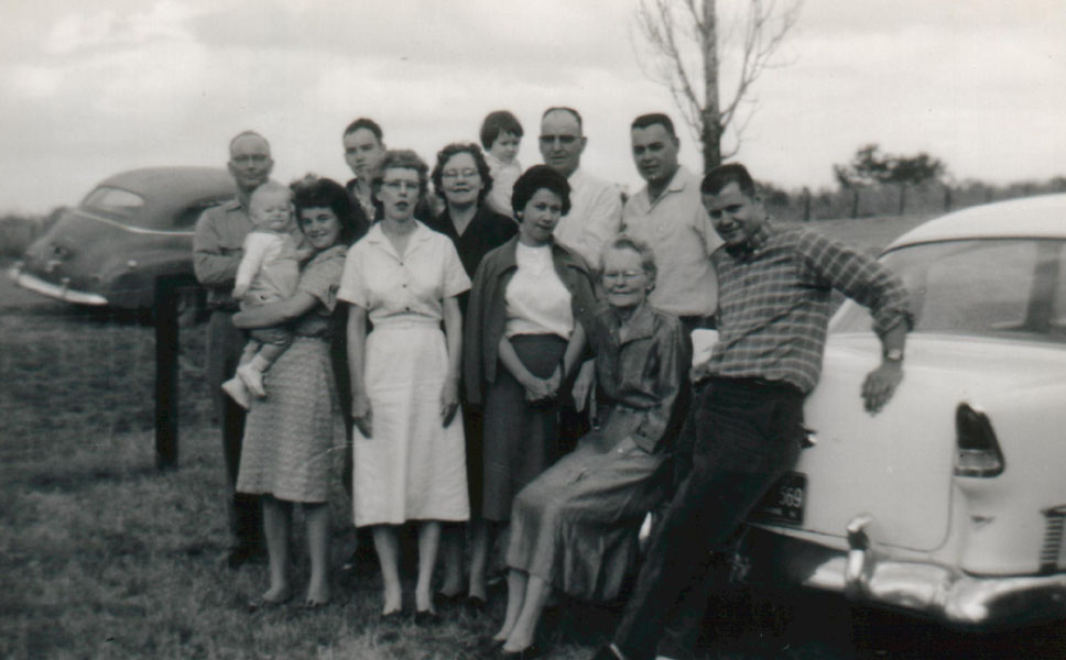(L-R) Edward Tew, Michael Dykes, Judy Watson, Don Tew, Percy Tew, Perla Tew, Mona Tew Jimmie Tew, Floyd Tew, Lola Tew, Kenneth Tew, Robert Dykes Photo taken next to Floyd Tew's store in Louisville, AL. 1961
